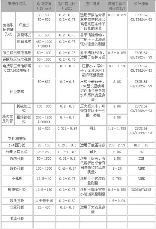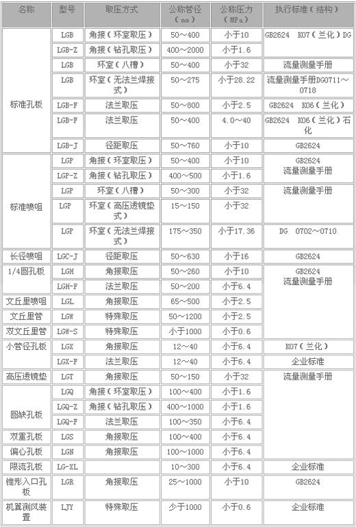1. 节流件:标准孔板、标准喷嘴、长径喷嘴、1/4圆孔板、双重孔板、偏心孔板、圆缺孔板、锥形入口孔板等