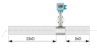 若传感器安装点的上游在同一平面上有二个90。弯头,则:上游直管段≥25D,下游直管段≥5D