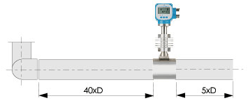 若传感器安装点的上游在不同平面上有二个90。弯头,则:上游直管段≥40D,下游直管段≥5D